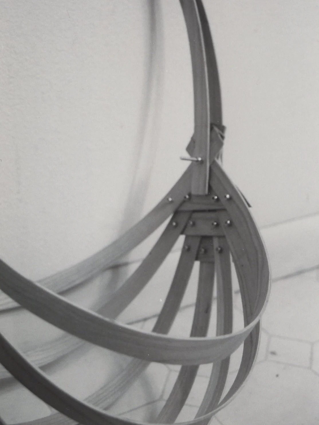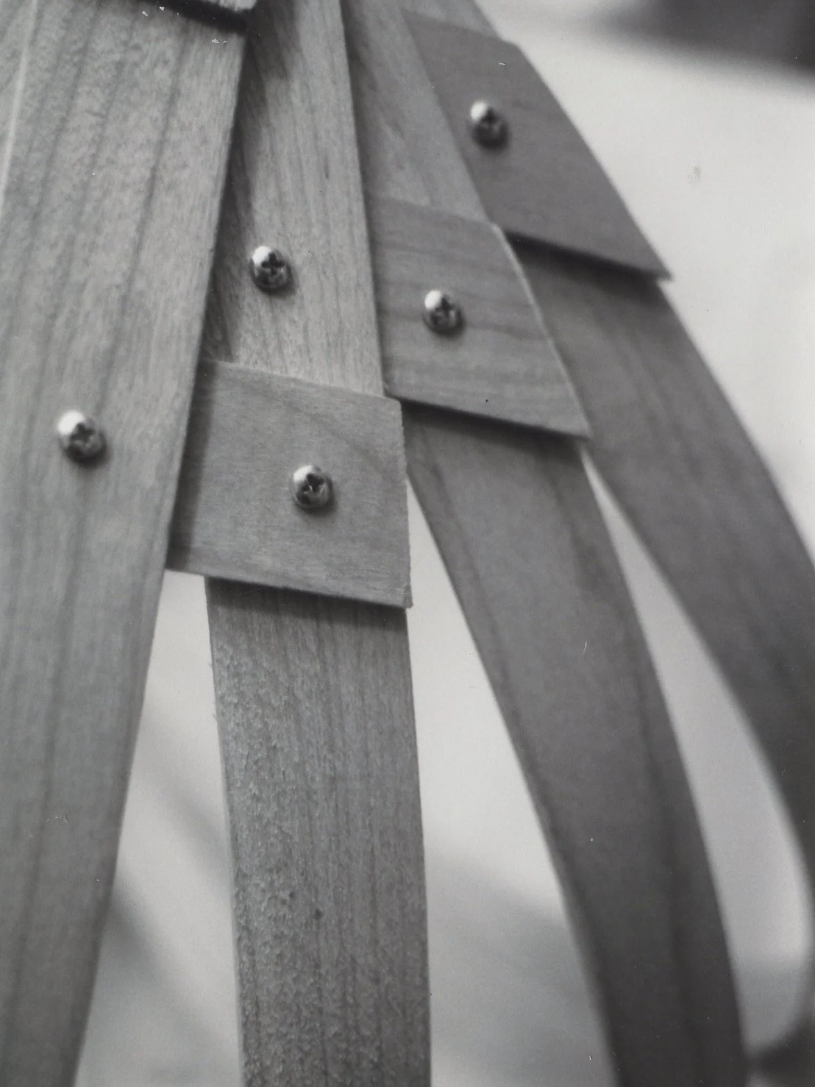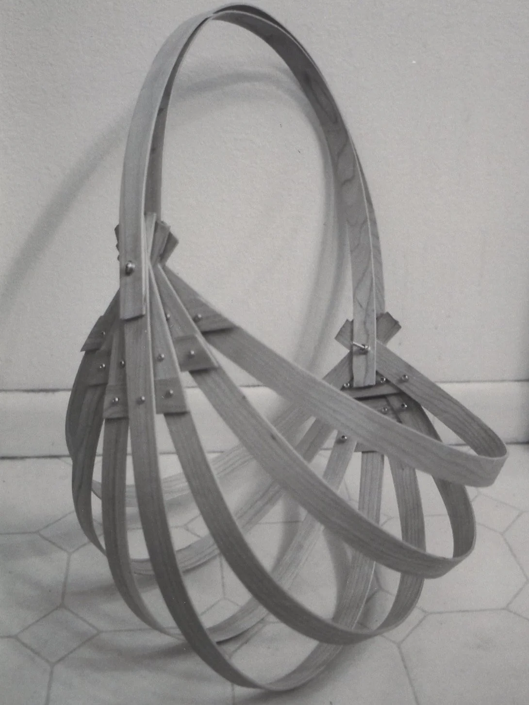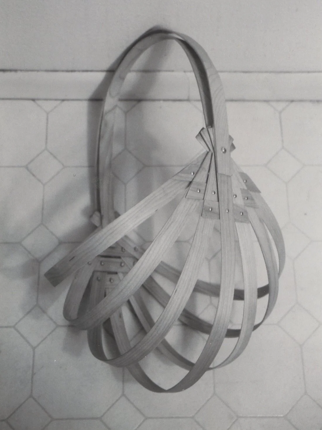 I made this simple basket from strips of cherry wood that were left over from making timber frame pegs. I bent the strips after soaking them in my bathtub, then fastened them together with the tiniest screws and nuts I could find.